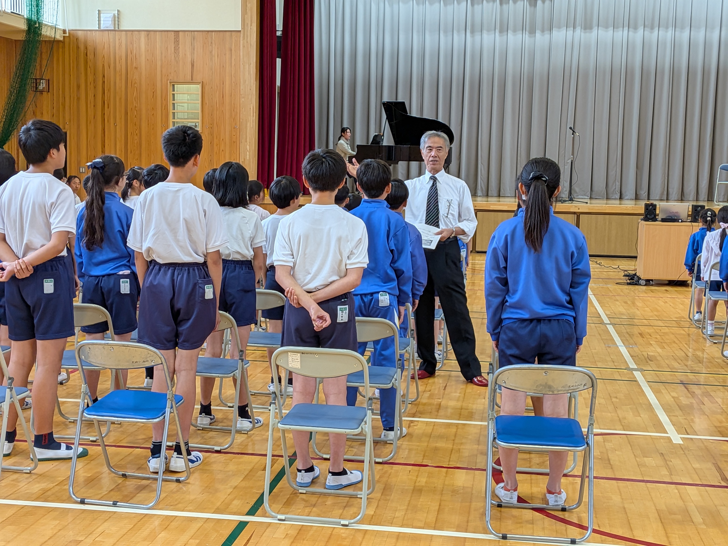 「この道」やモーツァルトの「魔笛」、「野ばら」、「オーソレミオ」、「帰れソレントへ」などの独唱に、子どもたちは静かに聞き入っていました。最後には「翼をください」をみんなで合唱し、心温まるひとときとなりました。