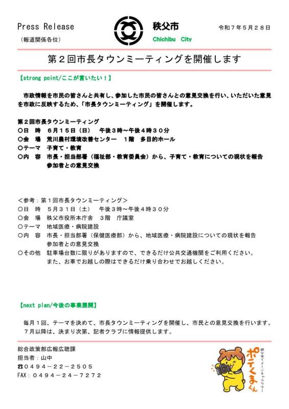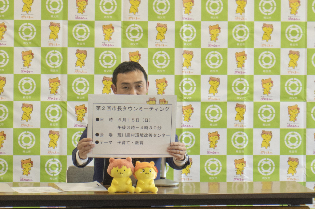 本日は、第2回の市長タウンミーティングの開催についてお知らせいたします。現在、秩父地域にお住まいの皆さまと直接意見を交わす「市長タウンミーティング」を毎月開催しており、皆さまとのコミュニケーションを大切にしています。