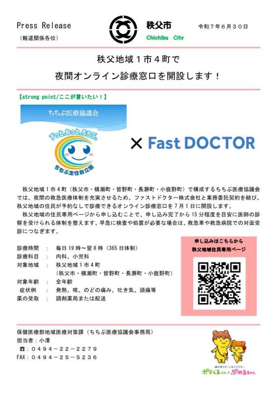 先日の記者発表でお伝えした、秩父地域の皆さんが予約なしで診療できる「夜間オンライン診療窓口」について改めてご紹介します。住民専用ページから申し込むことで、申し込み完了から約15分で医師の診察を受けることができます。